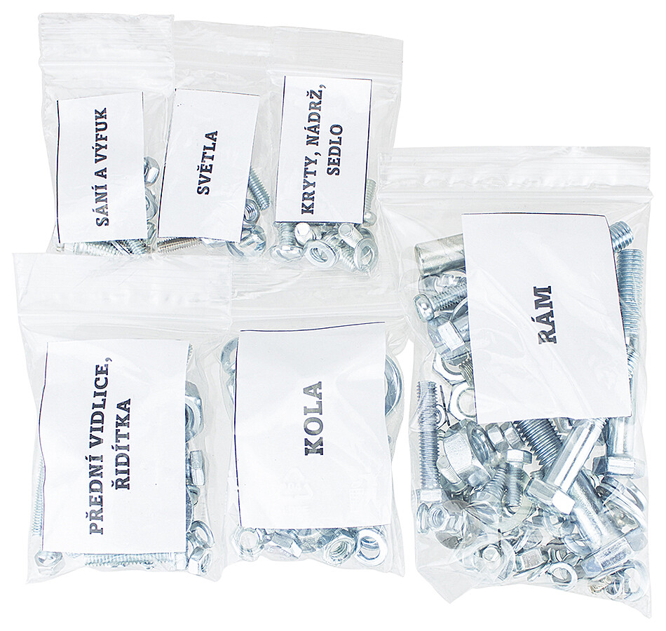Ez a készlet NEM TARTALMAZZA: Babetta 207 motorcsavar-készletet! Azonban megvásárolható e-boltunkban: https://www.motokramek.cz/sada-sroubu-motoru-b207