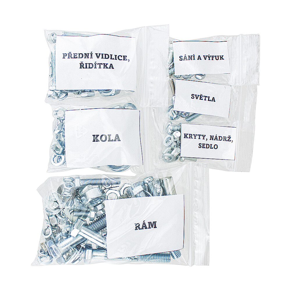 A készlet az egyes motorkerékpár-alkatrészek szerint kategóriákba van osztva, ami nagyban megkönnyíti az eligazodást és az összeszerelést: