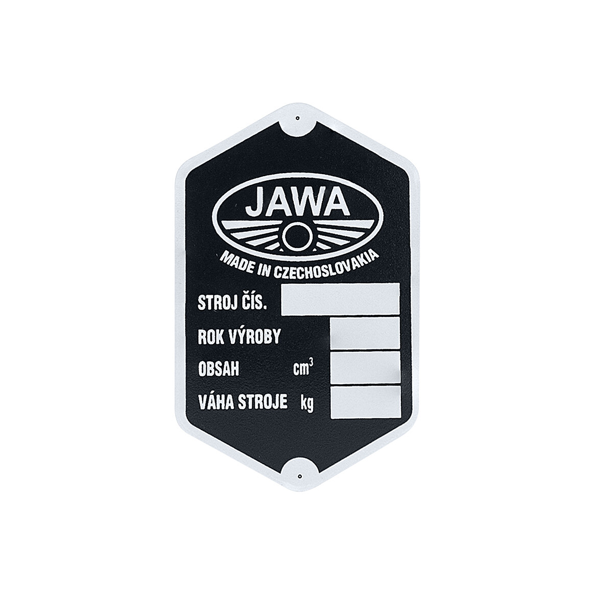 Nyomtatott alumínium vázcímke Jawa motorkerékpárokhoz.